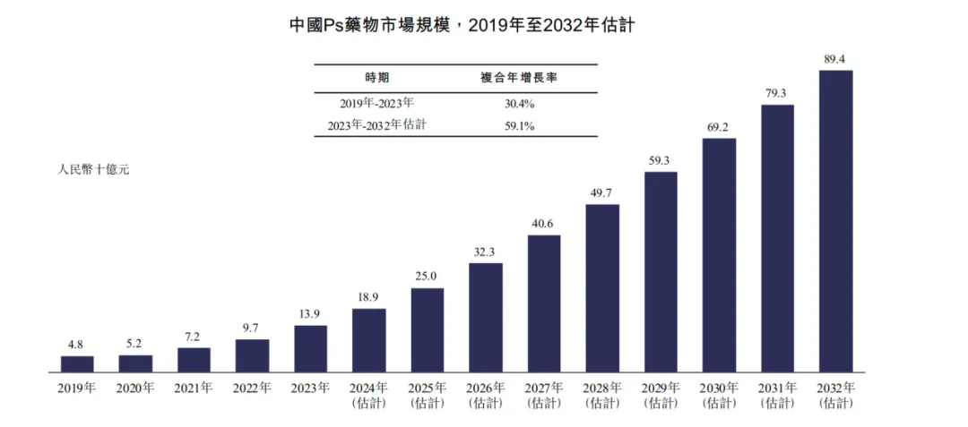 首先是银屑病大致人数上,欧美的患病率约1%~3%,而我国约为0.5%左右。考虑到我国人口为美国四倍有余,患病人数应该和美国可以画约等号。据2025年《中国银屑病诊疗指南》数据及相关报道,中国约有700万银屑病患者。而市场方面如图所示:中国银屑病药物市场规模2023年达到了139亿元人民币,(相较于2019年翻了接近3倍),预计到2032年其市场规模将要达到894亿元。年复合增长率达到了59.1%。