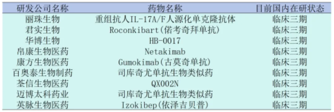 下表中这些临床三期阶段的管线,正在一个个走出临床三期阶段,进入上市阶段。除此之外,司库奇尤单抗的国内专利也快到期。这是利好吗?笔者认为不是,一个原研药的到期,将会导致多款生物类似药进入市场进行内卷,而司库奇尤单抗生物类似药已经有好几款进入到了临床三期阶段,一鲸落,万物生。