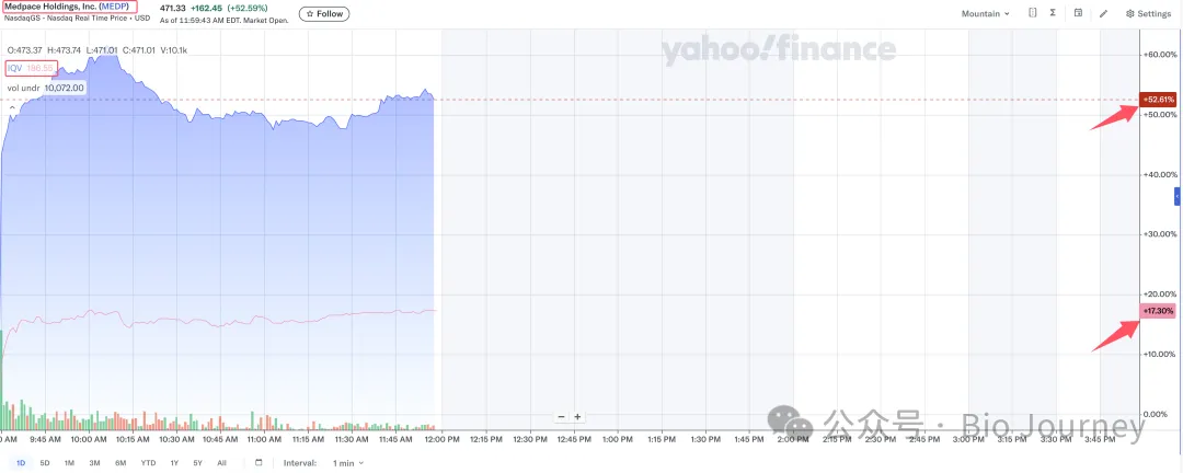 然而,随着第二季度财报的公布,CRO行业传来了好消息。IQVIA和Medpace的业绩超出预期,推动股价大幅上涨。Medpace股价($MEDP)周二飙升53%,而IQVIA股价($IQV)也上涨了约17%。