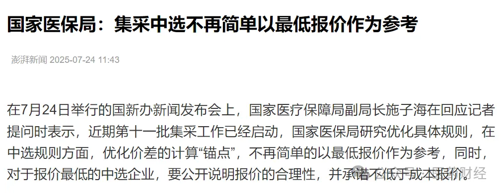 在2025年7月24日举行的国新办新闻发布会上,国家医疗保障局副局长施子海在回应记者提问时表示:近期第十一批集采工作已经启动,国家医保局研究优化具体规则,在中选规则方面,优化价差的计算“锚点”,不再简单的以最低报价作为参考,同时,对于报价最低的中选企业,要公开说明报价的合理性,并承诺不低于成本报价。