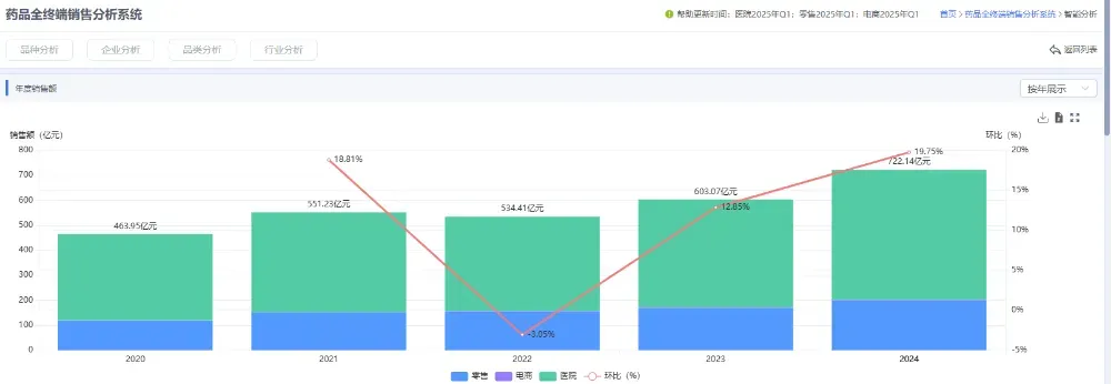 图片来源:CDE官网肺癌连续多年位居中国癌症发病率与死亡率榜首,非小细胞肺癌(NSCLC)占比超80%。据药智数据【药品全终端销售分析系统】显示,2024年国内三大终端(公立医院+零售药店+电商B2C)NSCLC治疗药物市场规模已突破720亿元,年增长率超19%。