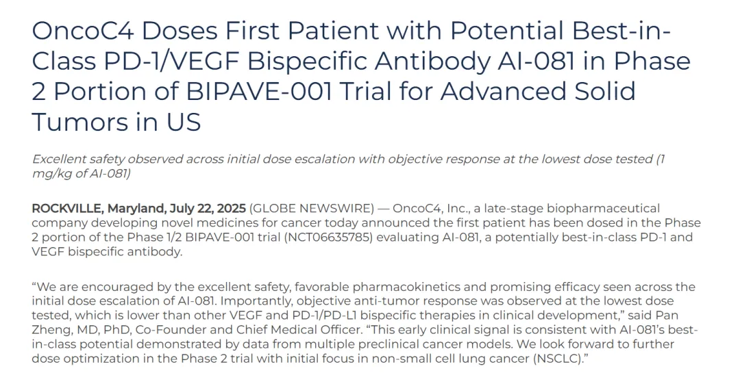 2025年7月22日,OncoC4宣布其PD-1/VEGF 双特异性抗体AI-081,在1/2 期试验 (NCT06635785) 的 2