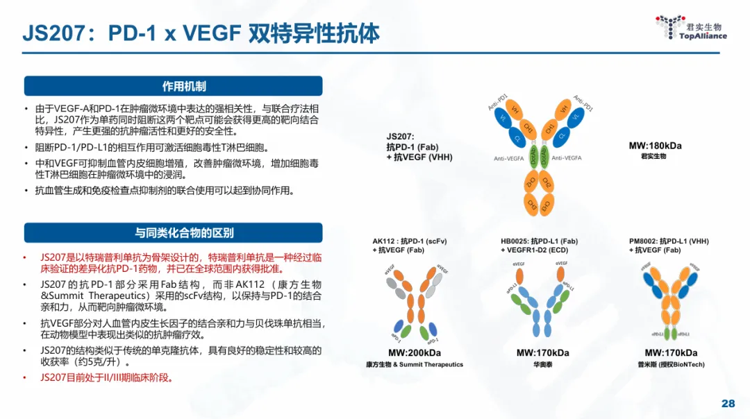 君实的PD-1/VEGF双抗药物同样为四价结构,但是VEGF纳米抗体包埋在PD-1抗体的铰链区中,具有显著的差异化结构,目前研发进度排在全球前四以内(康方公布PD-1/VEGF双抗机制,神药总有追随者)。