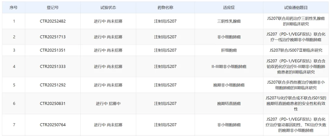 基于PD-1/VEGF疗法的全球加速,JS207在今年以来以来也加速明显,在多项实体瘤中开展了7项二期临床,甚至还其动能了一项联合Nectin-4