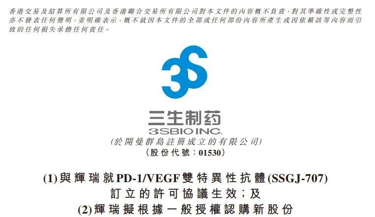 更值得注意的是,辉瑞追加1.5亿美元获得SSGJ-707在中国内地的独家商业化权利,同时认购三生1亿美元的股份。