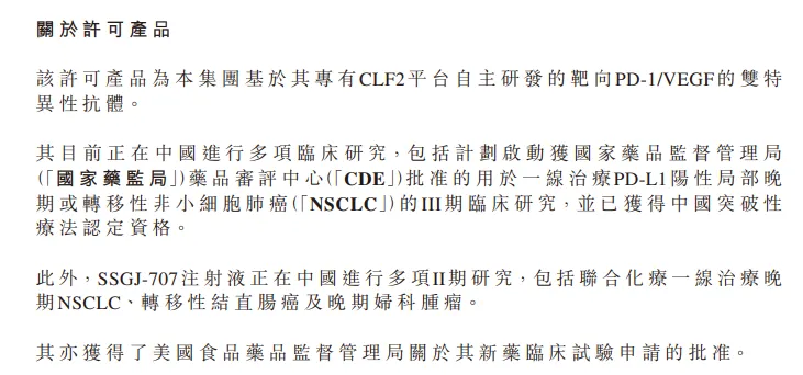 SSGJ-707为三生制药基于其CLF2专利平台开发的肿瘤板块核心管线,是全球第二款进入临床三期的PD-1/VEGF双抗药物,此前已经纳入突破性治疗药物程序。