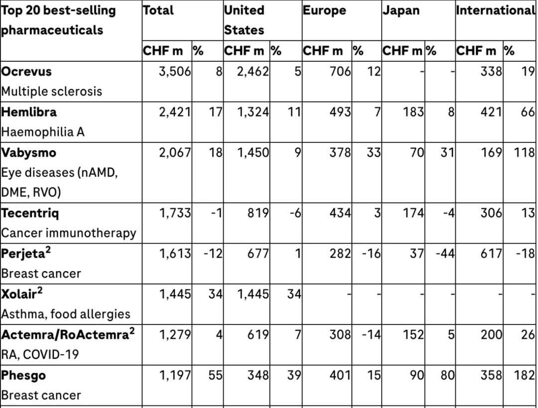 亿瑞士法郎;国际市场(含亚太、拉美等)增速最快,达14%,销售额53.24 亿瑞士法郎,Phesgo、Hemlibra等产品在新兴市场的推广成效显著。