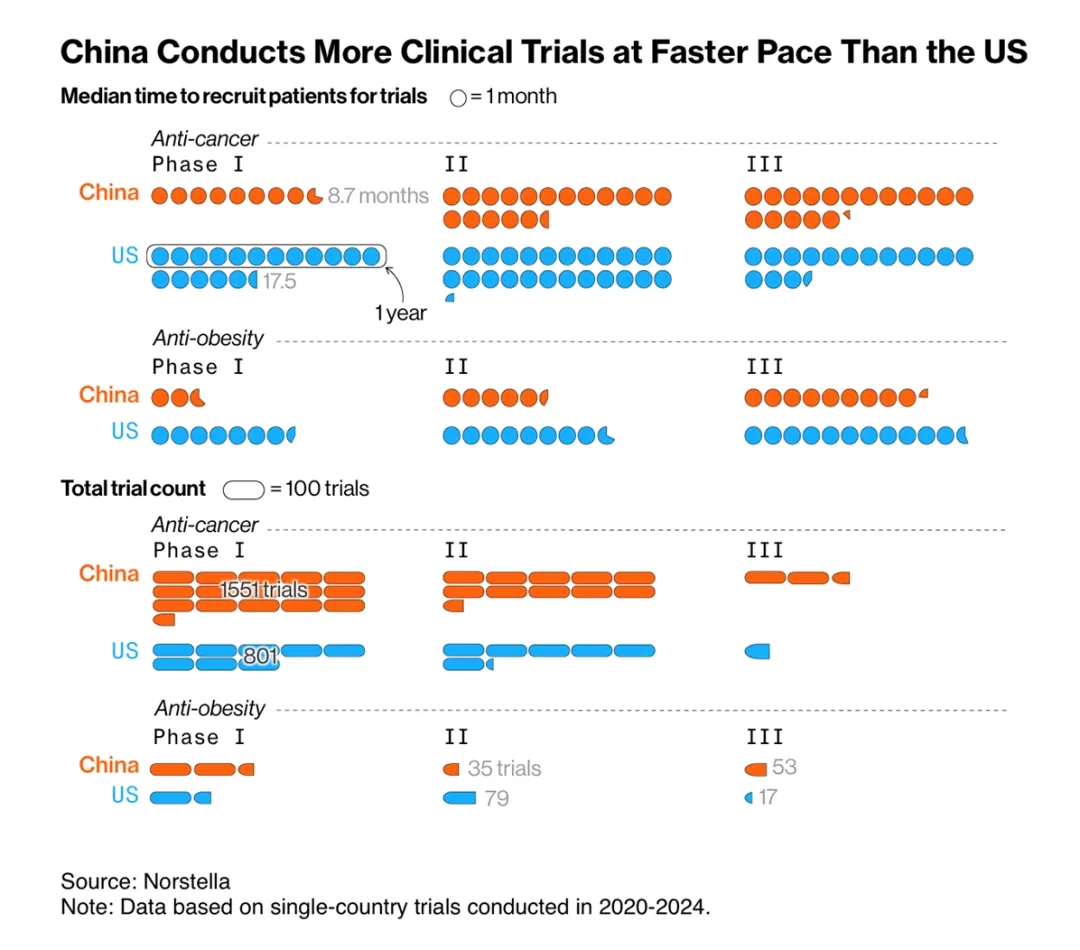 最近,彭博社援引Norstella的数据提到,中国的临床试验速度比美国更快(见下图)。