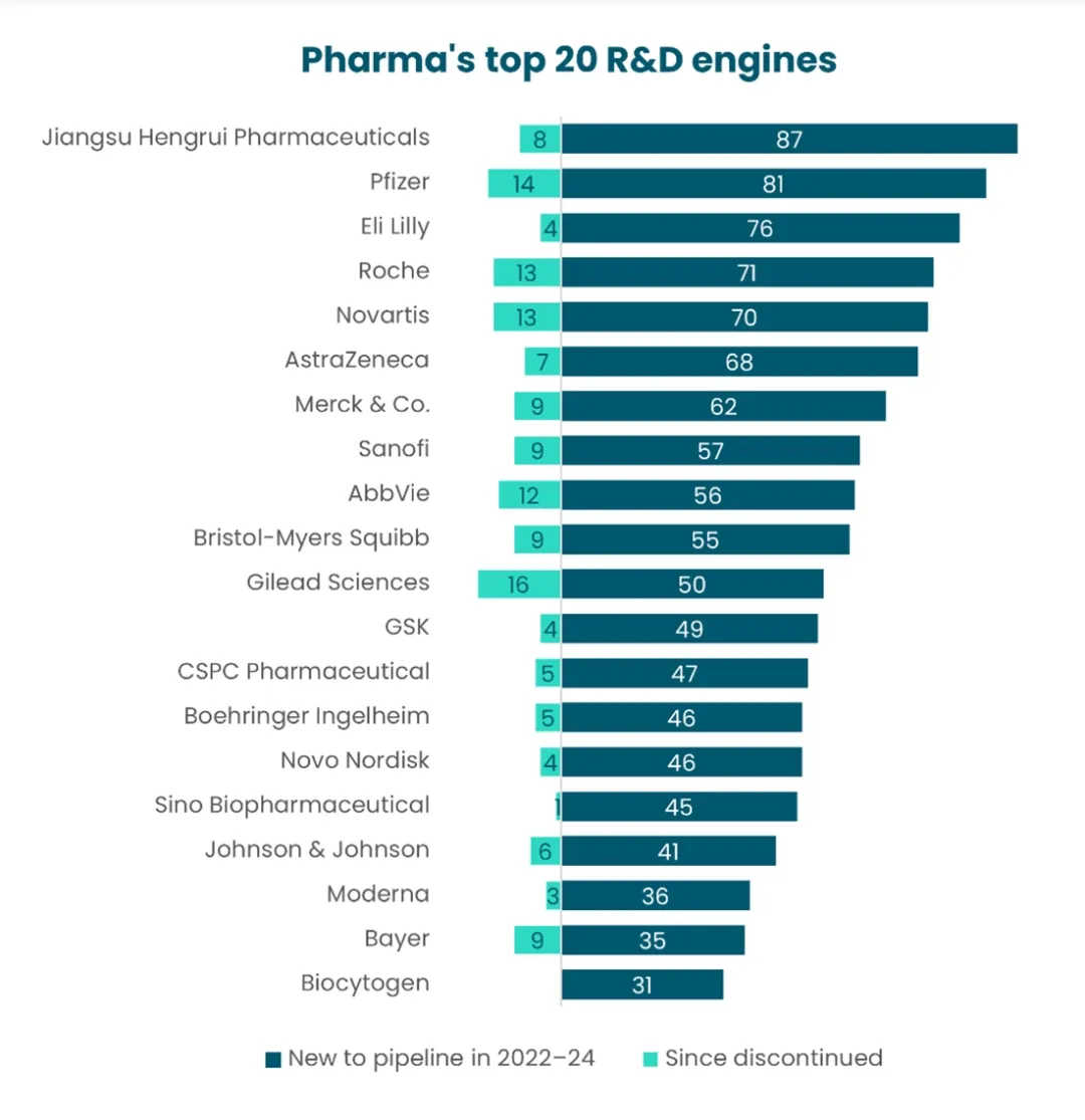 实际上,在今年早些时候,Norstella就给出观点认为,绝大多数情况下,制药企业的管线开发与营收和预算相匹配,而中国是一个非常大的例外。2024年全球20大研发投入最大的药企中,恒瑞医药以新增87条管线排在首位(见下图)。