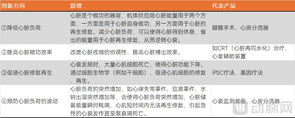 根据中国心血管医生创新俱乐部,目前,心衰治疗的创新技术路径可以分为四个方向:①降低心脏负荷;②提高心脏做功效率;③促进心脏修复再生;④预防心脏负荷的波动。