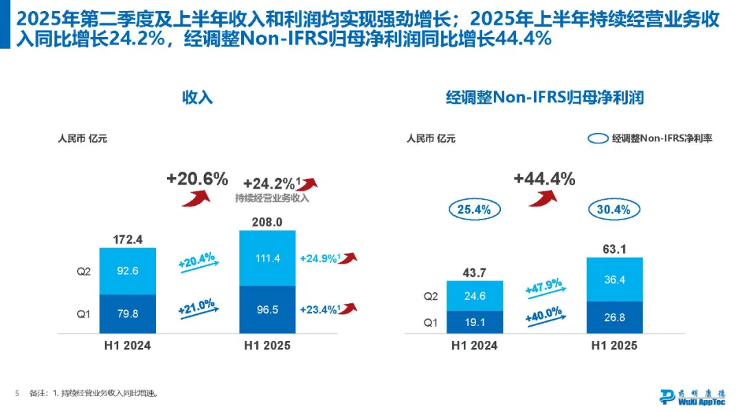 2025上半年,药明康德整体实现收入208.0亿元,其中持续经营业务收入同比增长24.2%,经调整non-IFRS净利润同比增长44.4%。