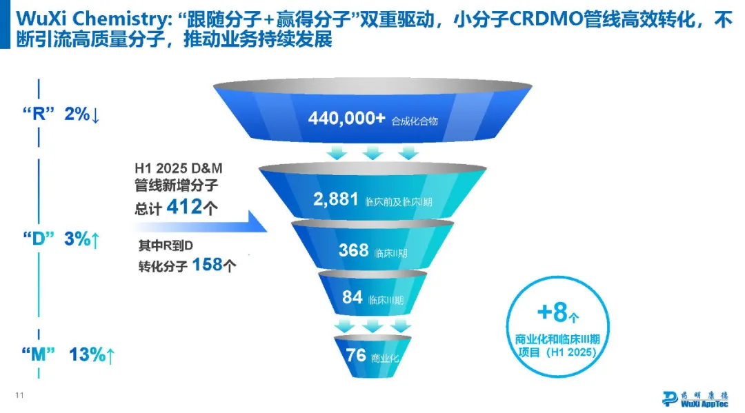 根据中期业绩报告,小分子CRDMO管线依然能够持续高效向下游转化。R端44万个化合物,帮助药明康德从源头囊括了大量的潜力分子。2025年仅上半年,药明康德小分子管线内R端向D端转化了158个分子;D&M端的后期分子新增了412个,总项目数量达到了3,409个;后端新增了8个商业化和临床III期的高价值项目。