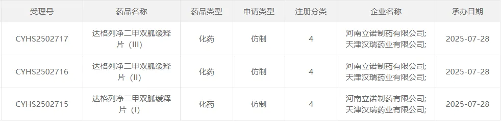 7月28日,CDE官网显示,河南立诺制药|天津汉瑞药业的达格列净二甲双胍缓释片(Ⅰ)、达格列净二甲双胍缓释片(Ⅱ)、达格列净二甲双胍缓释片(Ⅲ)同日报产获受理。在此之前,河北智恒医药科技的达格列净二甲双胍缓释片(Ⅰ)、河南大新药业的吡格列酮二甲双胍片、天津力生制药的达格列净片、湖南千金湘江药业的达格列净二甲双胍缓释片(Ⅰ)和达格列净二甲双胍缓释片(Ⅲ)等产品先后提交上市申请。