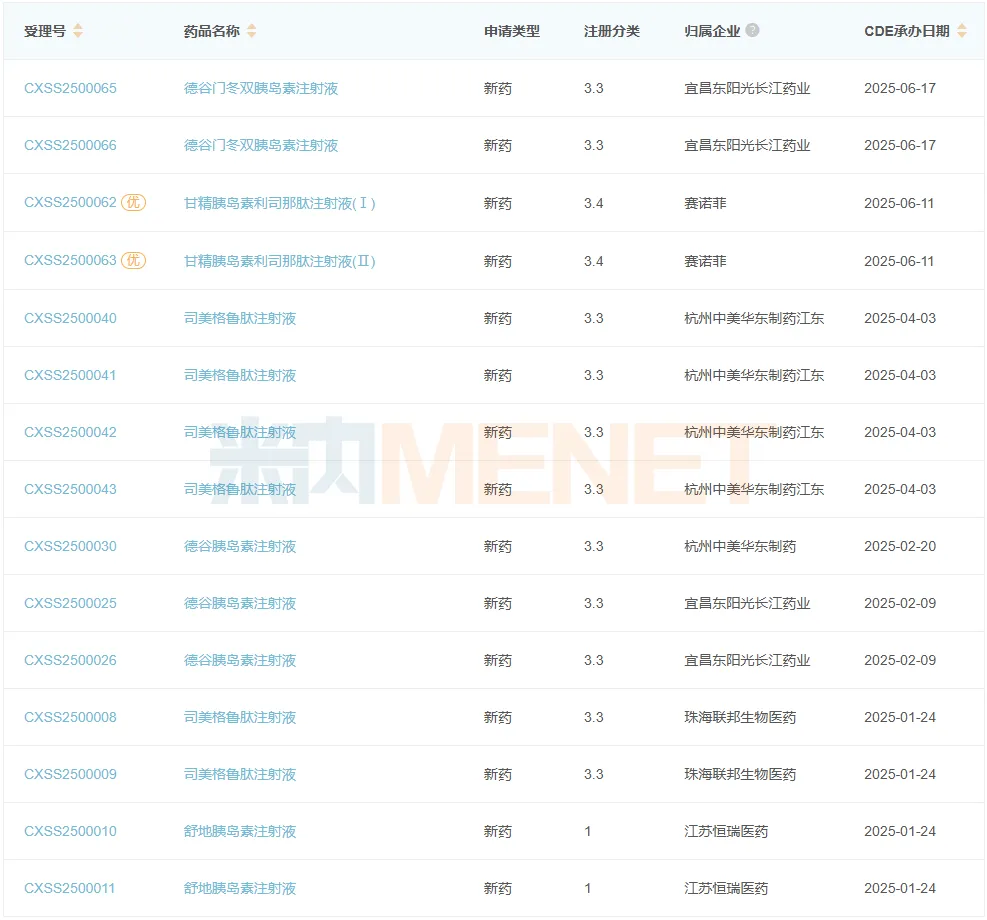 今年以来,糖尿病用药(化+生)已有超过160个受理号报产在审,涉及品种超过40个,其中,6个品种为新药,东阳光药(德谷门冬双胰岛素注射液、德谷胰岛素注射液)和华东医药(司美格鲁肽注射液、德谷胰岛素注射液)各有2个产品报产在审,舒地胰岛素注射液则是恒瑞医药首个胰岛素制剂。