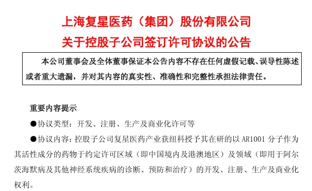7月28日,复星医药宣布其控股子公司复星医药产业业与纽科签订许可协议,获得纽科授予其在研的以AR1001分子作为其活性成分的药物于约定许可区域(即中国境内及港澳地区)及领域(即用于阿尔茨海默病及其他神经系统疾病的诊断、预防和治疗)的开发、注册、生产及商业化权利。