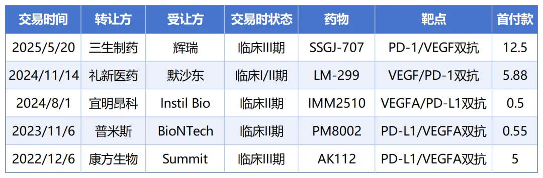 PD-(L)1 / VEGF 双抗出海BD交易(单位:亿美元)