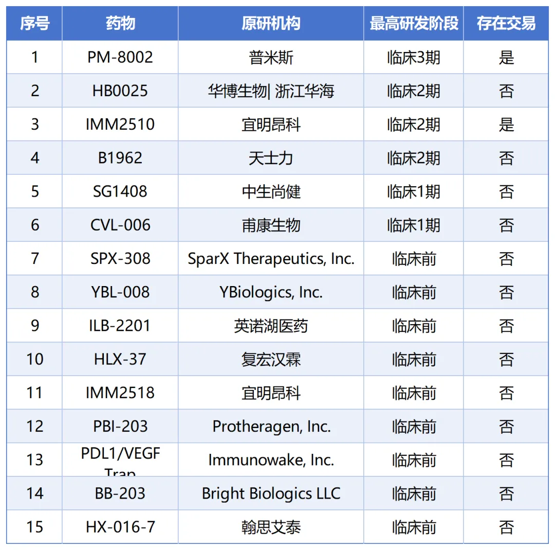 PD-L1/VEGF 15个产品中,其中6个处于临床阶段,普米斯PM-8002进展最快,处在临床三期。