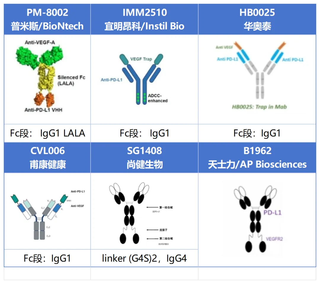 Format结构基本类似,且VRGF结合片段均采用VEGFR1D2连接在Pd-L1重链的N端;尚健生物和APBiosciences将VRGF结合片段连接在Pd-L1重链的C端。