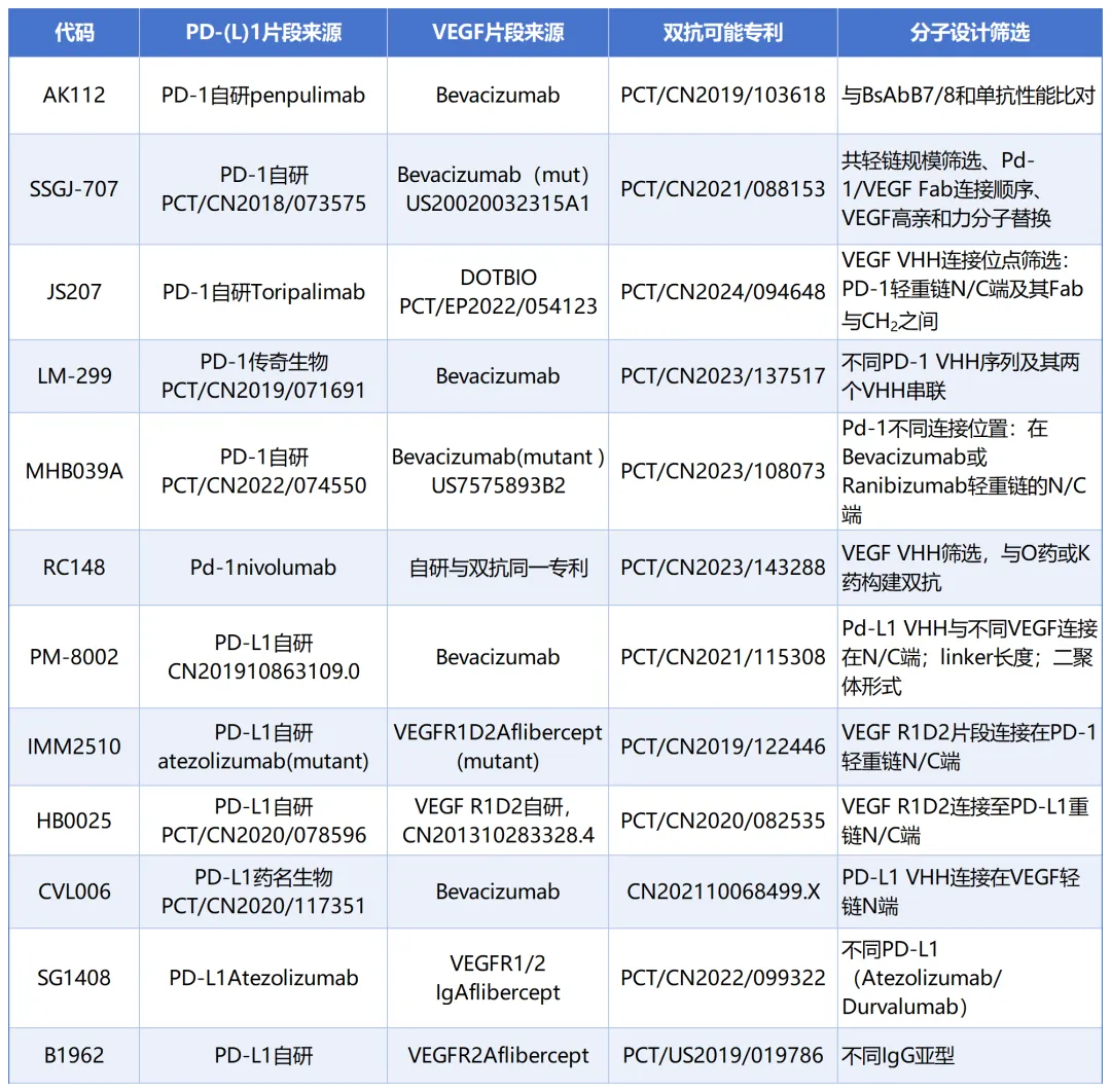 注:PD-(L)1片段来源或VEGF片段来源是指抗原结合片段序列部分或全部来源于表中产品;因部分产品未公开相关信息,代码和专利不能保证完全对应。