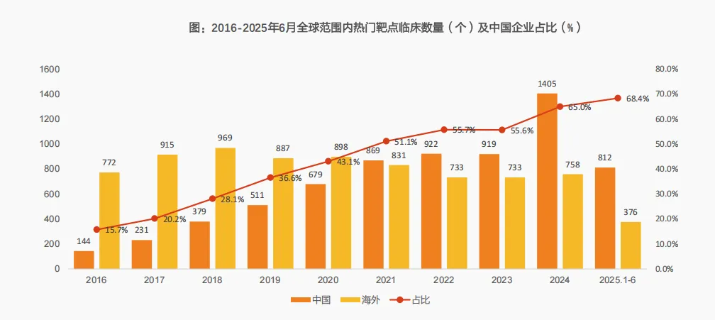 Insight数据库数据显示:在全球TOP10热门靶点(如EGFR、HER2、VEGF、IL-17、CD19、CLDN18.2、GLP-1等)的临床管线中,中国企业(按总部所在地统计)的占比从2016年的15.7%持续飙升至2024年的65%,首次突破全球一半;截至2025年6月,这一比例已升至68.4%,近七成热门靶点研发管线来自中国企业。