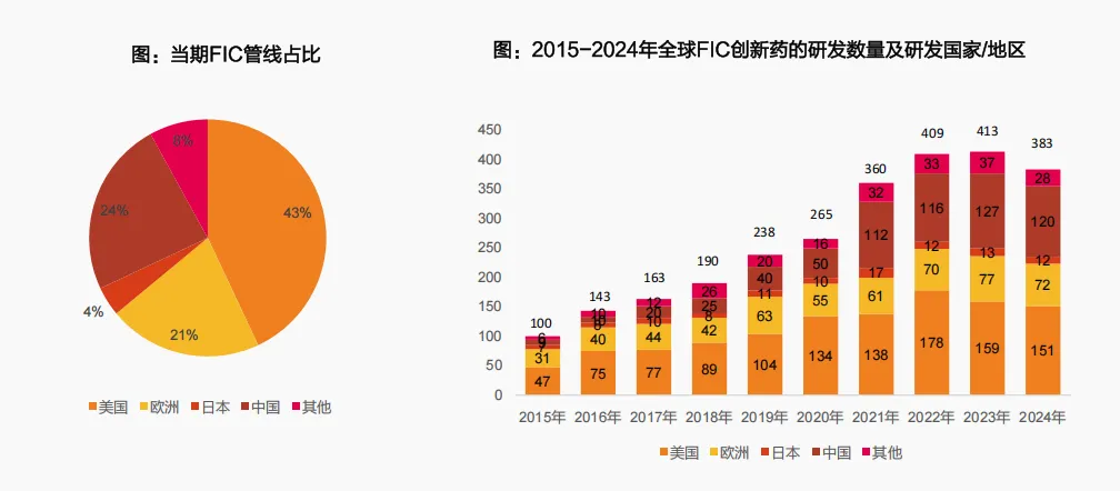 中国在源头创新领域的突破尤为亮眼:2015年中国自研进入临床的FIC创新药仅9个,全球占比不足10%;2024年这一数字增至120个,全球占比达24%,仅次于美国,成为全球第二大FIC研发力量。长期以来,中国药品研发以Me-too(仿创)、Me-better(改良型创新)为主,随着国家“以临床价值为导向”政策深化,企业正加速向Best-in-Class(同类最优)和FIC转型,研发“真创新”含金量持续提升。