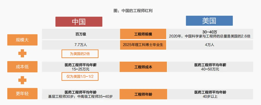 中国在医药工程师资源方面具备显著优势,表现为规模大、成本低、年龄轻三大特征。规模上,据CSET统计,中国理工科博士毕业生在2004年前后反超美国,并一路领先,根据预测,到2025年,中国大学毕业的理工科博士人数约为美国的两倍,除此之外,中国博士教育的质量也在持续提升。成本上,中国医药工程师的年薪仅为美国的1/3-1/2;年龄上,中国比美国年轻近10岁。这三大优势共同构成了中国在医药工程师方面的“红利”,为未来科技和产业发展提供坚实支撑。