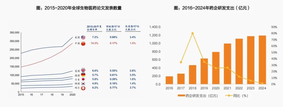 一方面基础研究持续发力。从发表论文数量看,中国生物科学及医学相关论文产出快速提升,已经成为仅此于美国的第二大生物科学及医学论文产出国:2015-2020年中国生物医学领域论文发表数量以14.3%的年均复合增长率快速攀升2020年发表量达近29万篇。