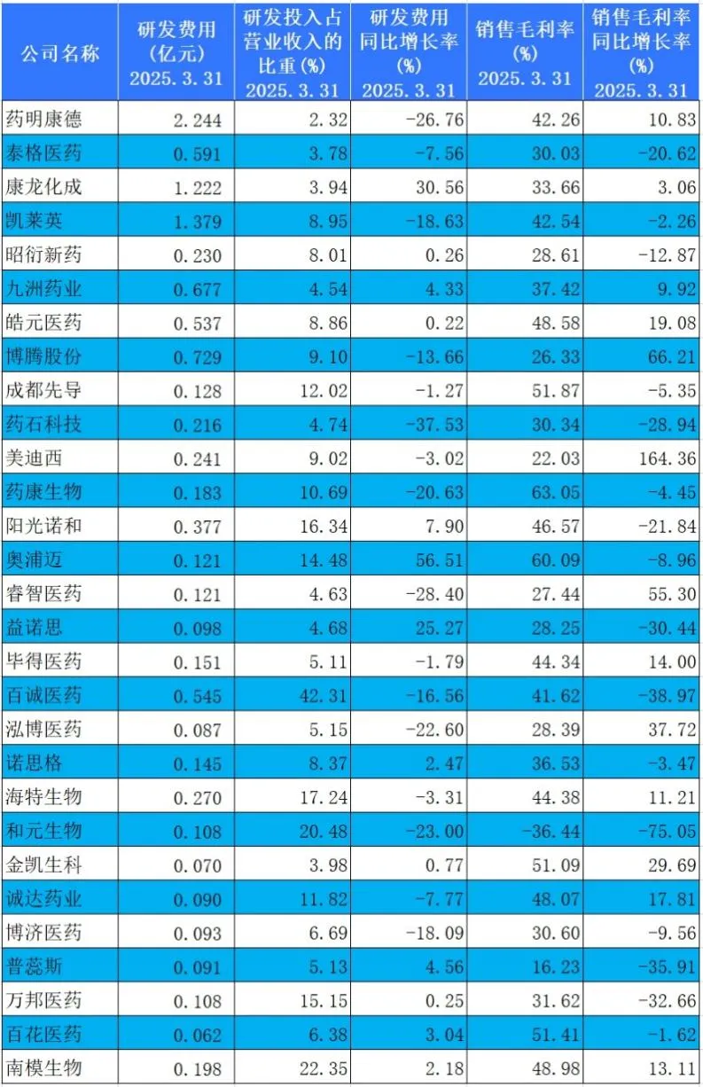 29家公司研发及毛利率情况(2025年一季报)