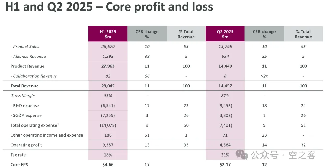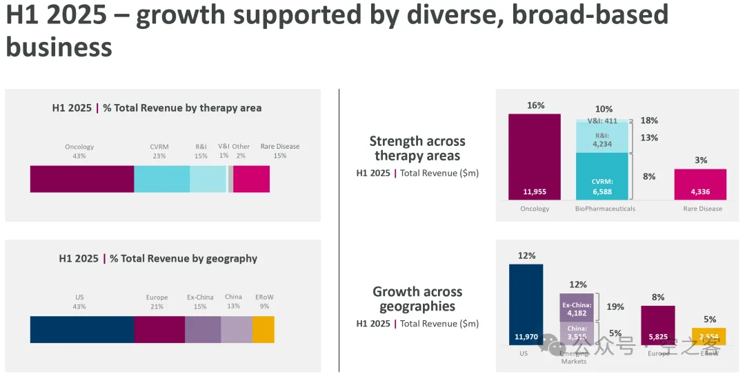 二季度核心业务收入同比增长11%、EPS同比增长12%,在MNC中处于靠前的水平;更令人赏心悦目的是,在肿瘤/心血管/呼吸/罕见病等板块、美/欧/中等市场的增长都非常均衡(即使是粗了大事的中国市场也保持着5%正增长)。