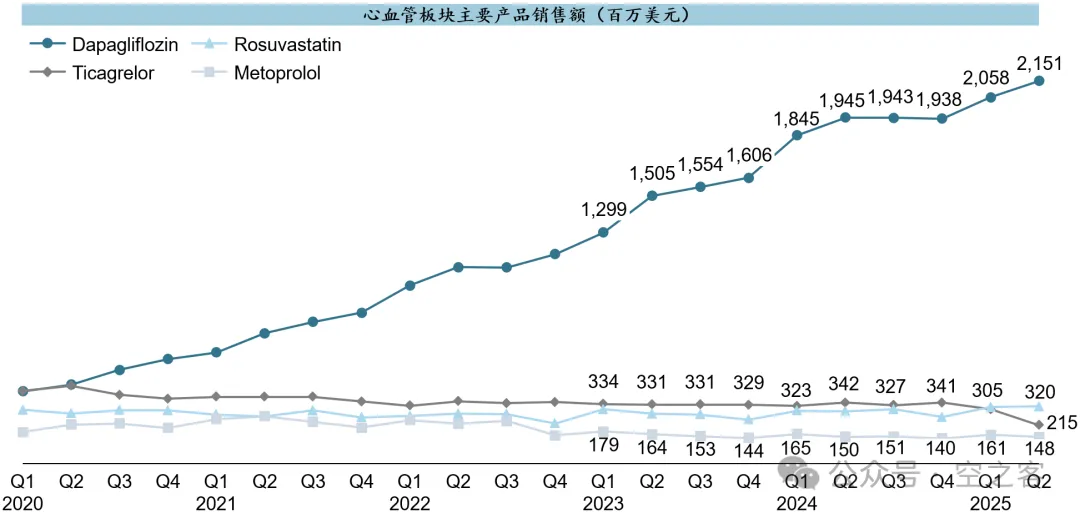 心血管板块就靠大腿Dapagliflozin的炸裂表现带飞,在心衰和CKD两大适应症获批后,销售额爬升姿态完全不似已经上市超过10年的老药,单季冲破$2b大关后维持着10%增速一路上攻、LTM累计已接近$8.1b,在降糖领域已经有GLP-1这种毁天灭地大杀器存在的情况下依然十分耀眼。