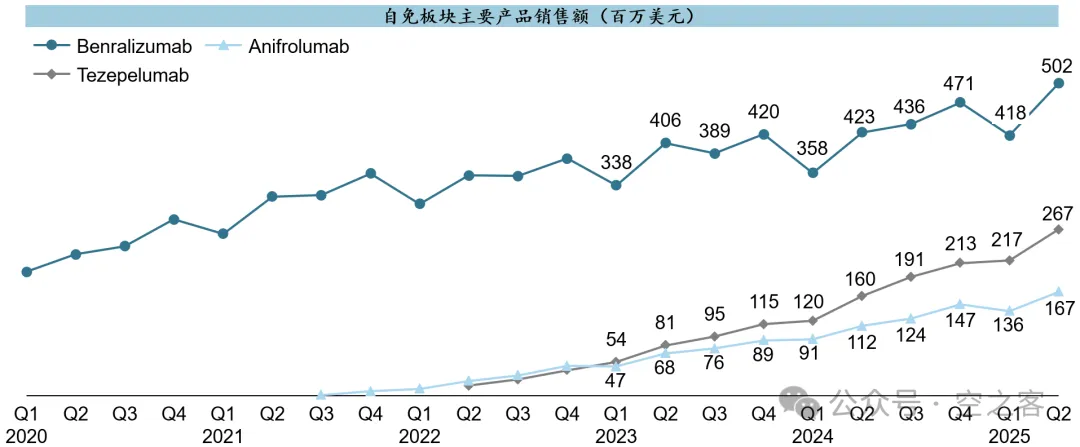 自免板块虽然没有那么闪耀的超重磅品种,但也都还算有看点,特别是TSLP单抗Tezepelumab上市两年来爬坡势头不错。