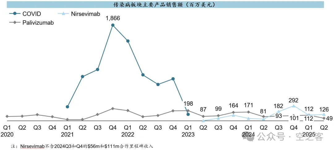 在后新冠时代,传染病板块主要靠RSV,不过Nirsevimab上市后的体量还远不及预期,LTM累计$712m。