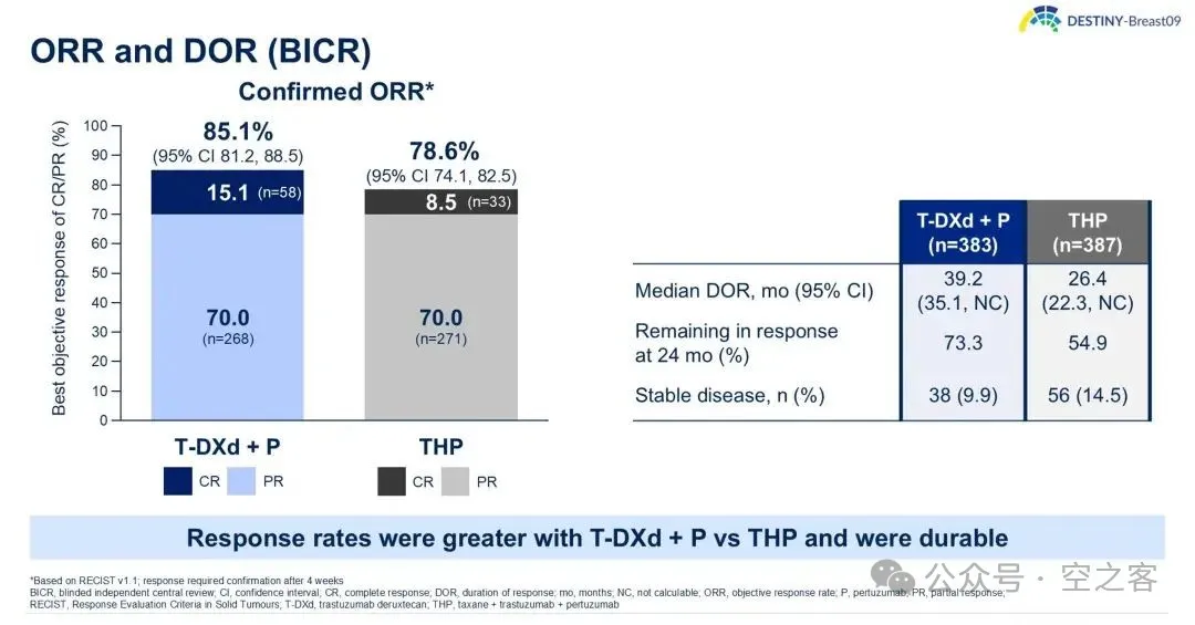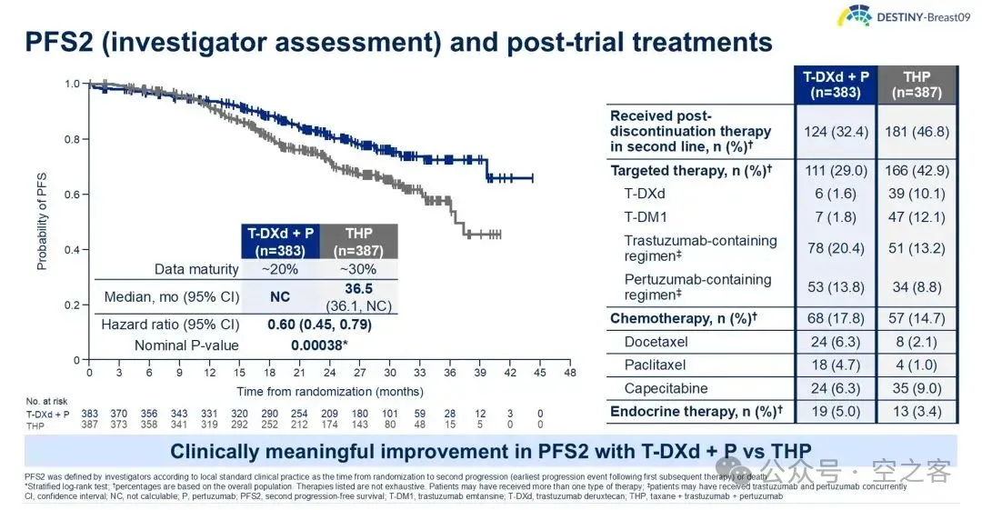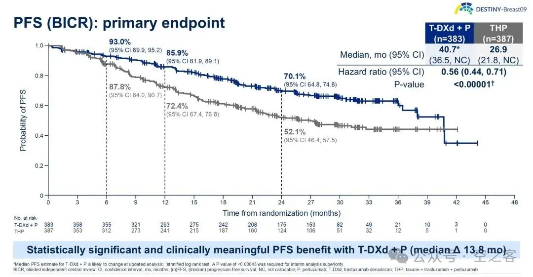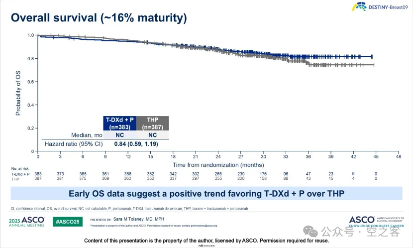 大杀器Enhertu在二线站稳脚跟后,终于在一线迎来历史性突破,在ASCO上公布的DESTINY-Breast09三期临床试验中,T-DXd联合Pertuzumab与标准治疗方案“妥妥组合”(Taxane+Herceptin+Perjeta,THP)对照,mPFS对比为40.7 vs 26.9个月(HR=0.56)、PFS2亦有优势(HR=0.6),ORR对比为85.1% vs 78.6%、mDOR也显著延长,OS尚不成熟、但已有改善趋势,这一结果将十多年前CLEOPATRA试验所定义的1L HER2+ BC金标准直接向上拔高了14个月的PFS,绝对具有里程碑意义。此外,另一项重要的三期临床DESTINY-Breast11试验也公布取得积极结果,针对早期患者的新辅助治疗,T-DXd联合THP与标准化疗方案联合THP,显著提高pCR,具体数据等ESMO。