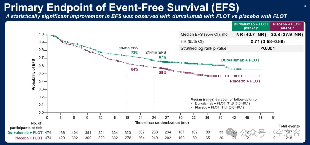 Durvalumab也老夫聊发少年狂,在ASCO上公布的三期临床MATTERHORN试验结果中,针对围手术期的胃癌患者,Durvalumab联合标准化疗方案FLOT与单独FLOT相比,EFS改善非常显著(HR=0.71),pCR对比为19%
