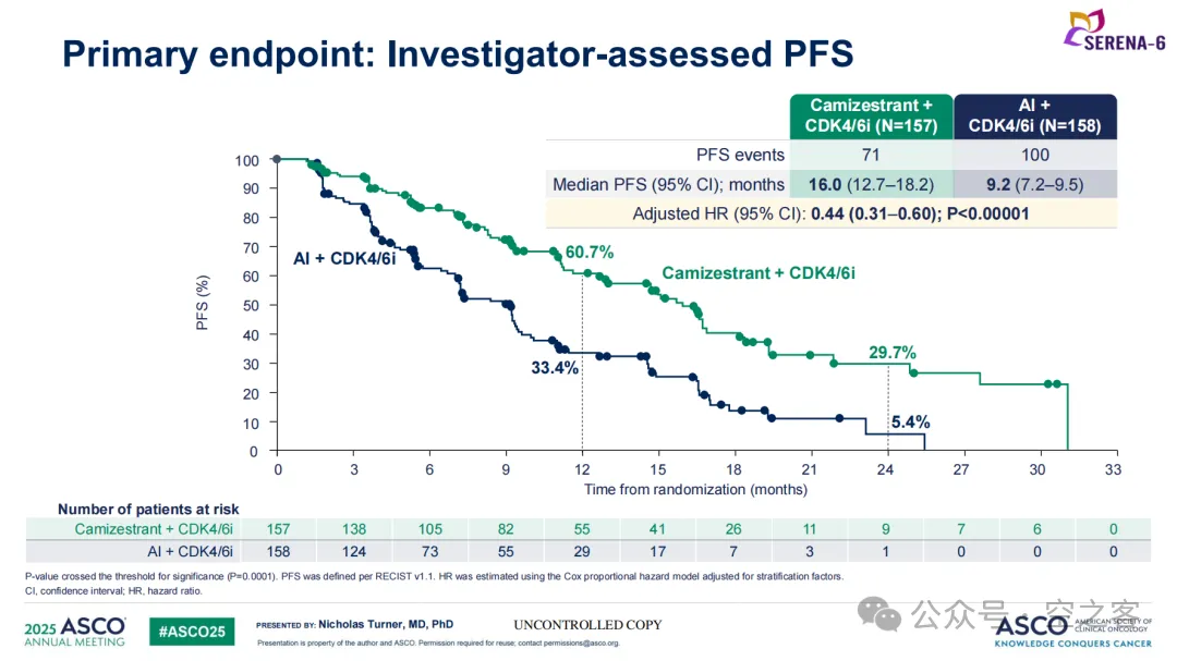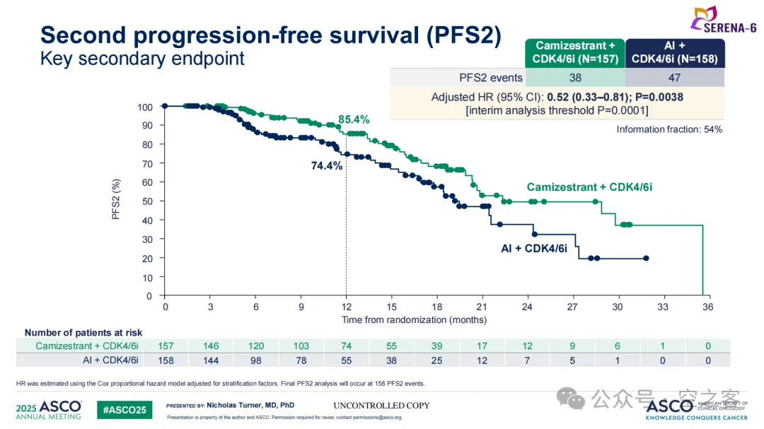 口服SERD药物Camizestrant同样在ASCO上公布了三期临床SERENA-6试验中期分析的具体数据,针对一线ESR1m HR+/HER2- BC患者,Camizestrant联合CDK4/6抑制剂与AI+CDK4/6相比,mPFS为16.0 vs 9.2个月(HR=0.44),PFS2的HR=0.52,OS尚不成熟。这一结果不仅使得Camizestrant成为首个成功挤入一线的新一代口服SERD(sNDA已提交),而且更有意义的是在内分泌治疗作为HR+ BC治疗基石的情况下,一旦出现ESR1突变、即使未出现影像学进展,可立即从AI换药成SERD,有望改写整个领域的治疗范式。