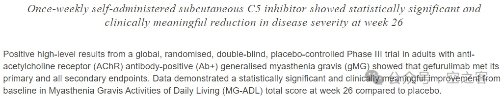当年“冤大头”式收购Alexion得到的C5单抗Gefurulimab,总算也在上述前两代C5日渐式微的情况下,又让这笔收购巨款听了个响儿。在治疗AChR抗体阳性的gMG三期临床PREVAIL试验中,Gefurulimab达到所有主要和次要终点,其中26周时MG-ADL评分较基线得到显著改善。不过以当前gMG这种卷的程度(各路CAR-T、TCE、FcRn、APRIL/BAFF都在玩命招呼),C5到底能争下多少份额还有待观察。
