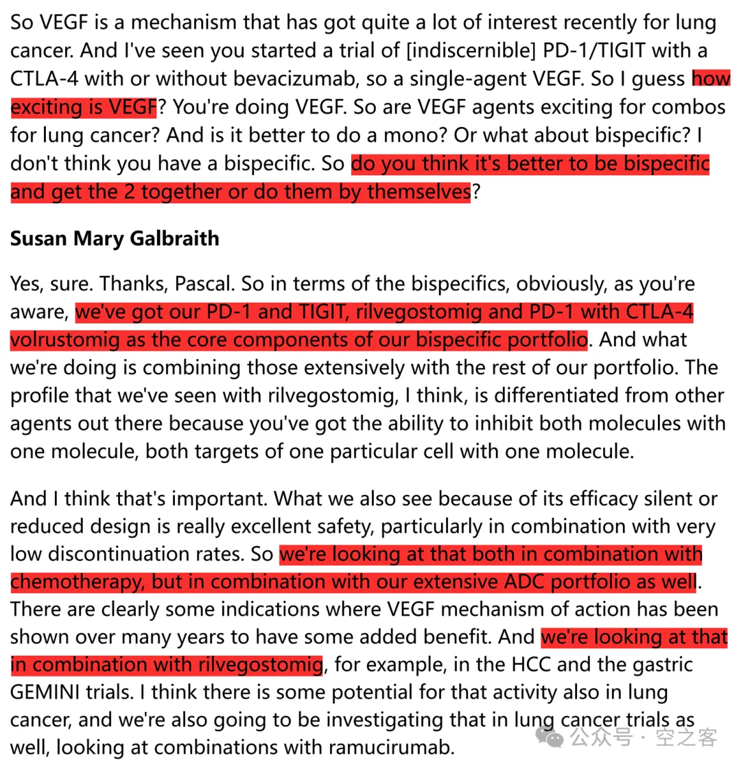 作为全球肿瘤扛把子,AZN迟迟没有在PD1/VEGF上表态,自然也成为诸多中国公司盯着的潜在大买主。就在这个季度,公司首次将IO双抗单独作为一个策略写进了NSCLC的布局,然而目前这个策略的支柱是PD1/TIGIT和PD1/CTLA4,且分析师们拐弯抹角地试探对VEGF态度时,也得到了模棱两可的回答,你要说他们心里真的指望TIGIT和CTLA4这路货色能实现如此宏大的愿望,反正我我是不太信的。
