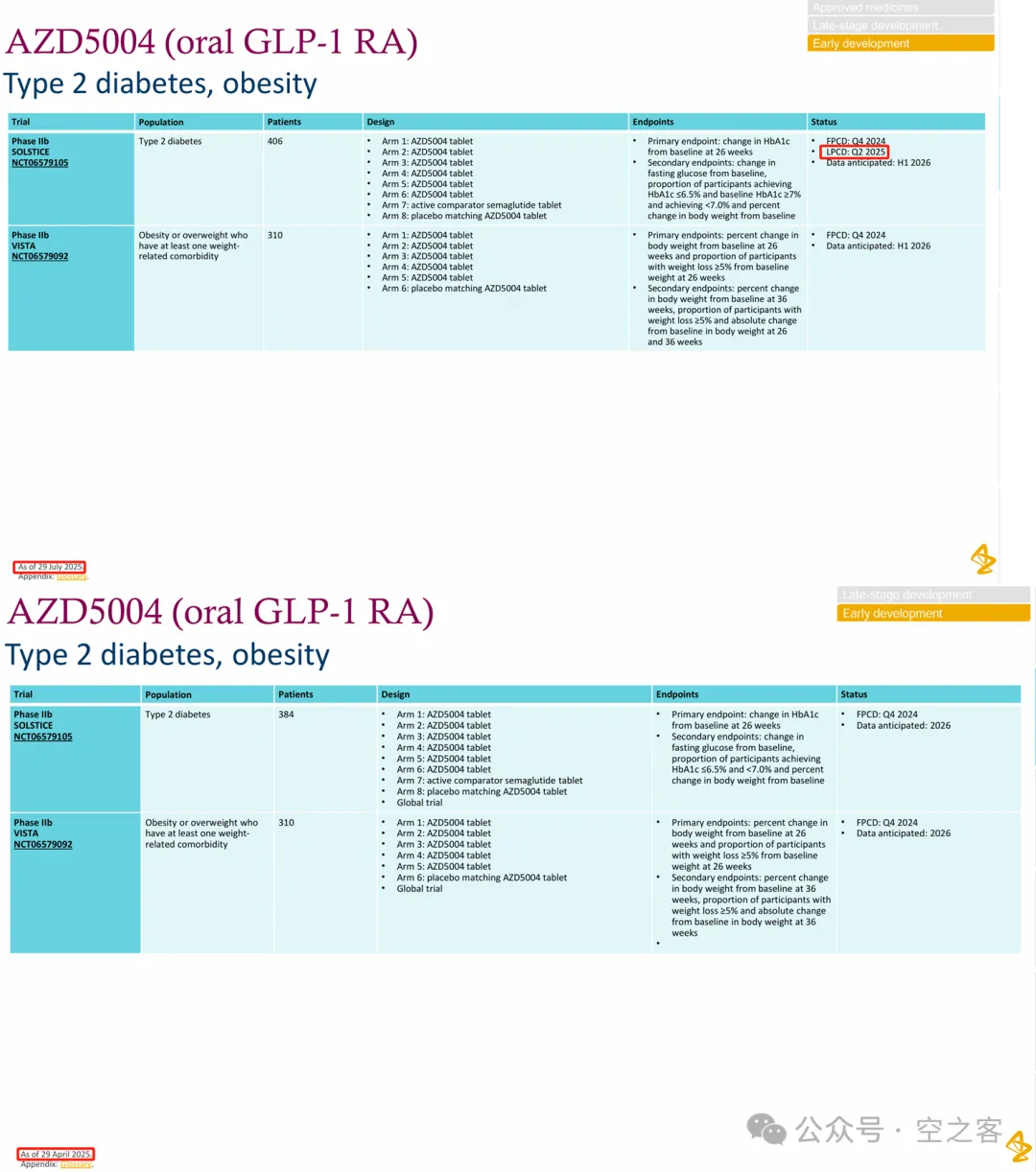 另一个备受瞩目的与中国企业合作的品种ECC-5004,已经有略长时间没有更新临床进展,甚至一度陷入了不利的传闻,这个季度终于悄然在附录里更新了糖胖二期临床SOLSTICE试验完成给药的信息。