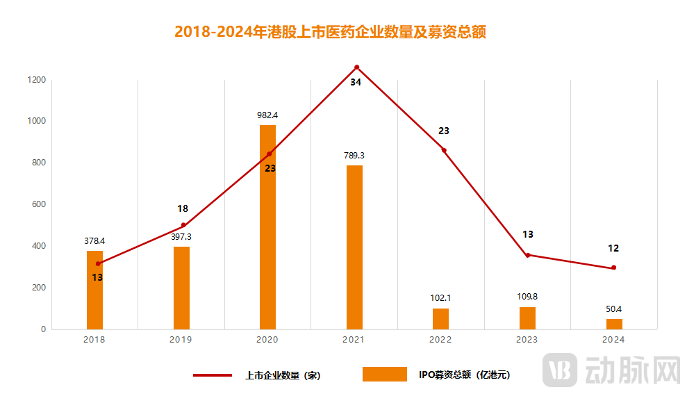 图2.2018-2024年港股上市医药企业数量及募资总额(动脉网制图)