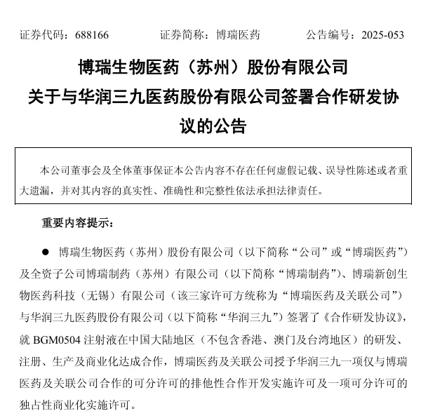 其临床进度最快的、对标礼来替尔泊肽的双靶产品BGM0504,授权给华润三九,里程碑付款合计最高可达