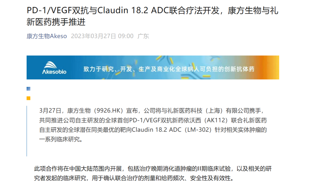 值得注意的是,笔者并没有查到康方和宜联关于联合用药的合作公开信息,反倒是两年前,礼新医药一度牵手康方,共同推进AK112联合礼新医药的CLDN18.2 ADC药物LM-302的临床开发,但这项临床似乎并没有开展过,并随着礼新生物开发自主的PD-1/VEGF双抗(默沙东终于信了:5.88亿美元首付款引进礼新PD-1/VEGF双抗),这项合作就难进行下去。