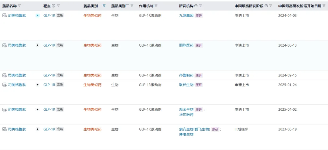 医药魔方数据库显示,国内还有多款司美格鲁肽生物类似药已申报上市,包括九源基因、丽珠医药、齐鲁制药、联邦生物、华东医药/派金生物。