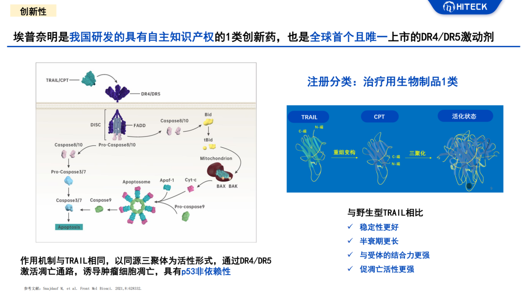 沙艾特全球首个且唯一上市的死亡受体4/死亡受体5(DR4/DR5)激动剂,沙艾特作用机制与TRAIL(肿瘤坏死因子相关凋亡诱导配体)相同,与DR4/DR5结合激活凋亡通路,通过“外源性凋亡通路”杀伤肿瘤细胞,且具有p53非依赖性。