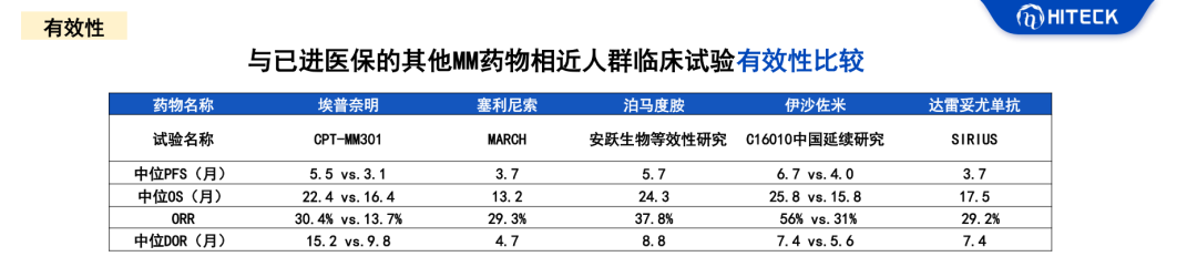 2)疗效-在同类RRMM人群中,沙艾特方案在OS和DOR上均比卡非佐米方案延长≥6 个月,且对p53缺失等高危亚组优势更大(非头对头);
