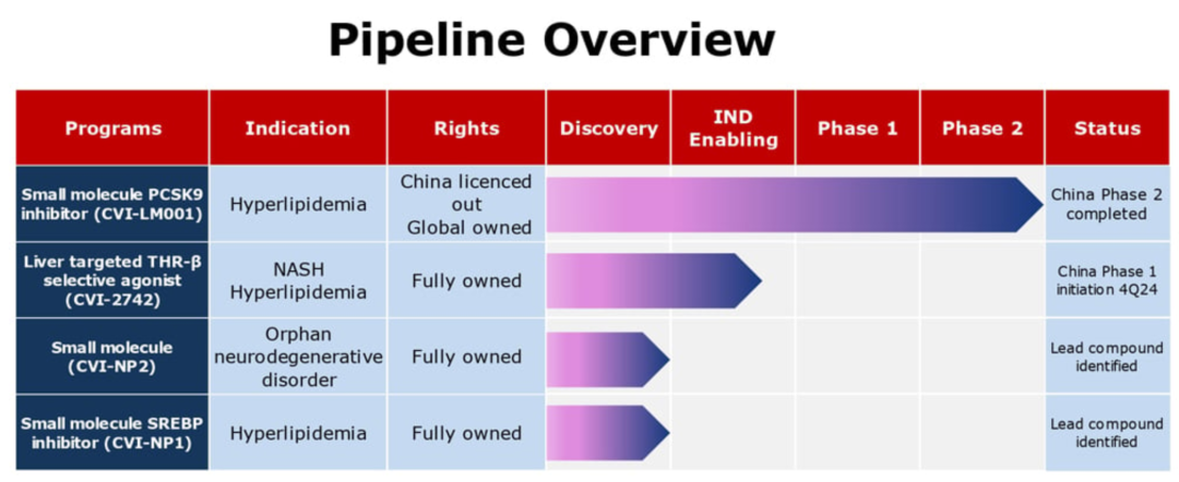 西威埃医药是一家专注于心血管和肝脏代谢疾病创新药的Biotech,其核心管线是口服小分子PCSK9抑制剂CVI-LM001,另外还有进入临床的THR- β选择性激动剂CVI-2742,在治疗NASH和NAFLD患者方面具有同类最佳潜力。