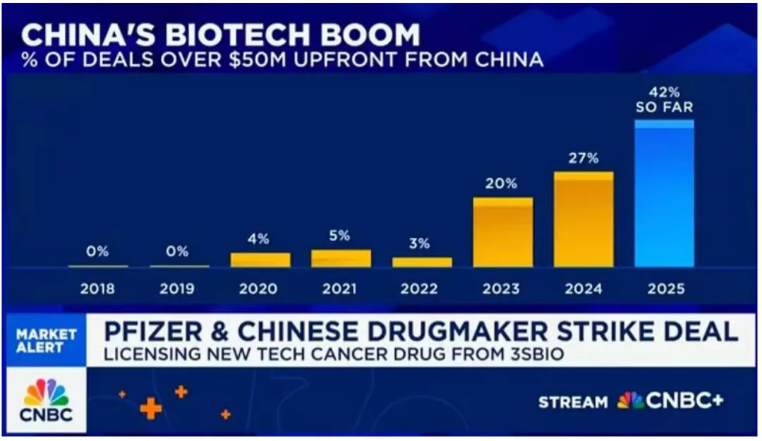 据统计,截至5月份,跨国药企手中首付款5000万美元以上的BD交易,超过40%来自中国生物科技企业。而在四年前,这一比例还不足5%。