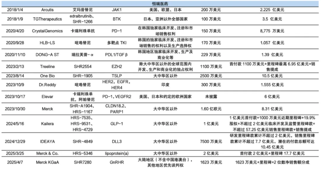 目前来看,不管是pharma还是biotech阵营,均有形成丰厚业绩蓄水池的选手。例如,恒瑞医药近三年完成近10笔合作,至今累计交易近15笔,金额约140亿美元。其中部分管线可能会有“意外”,但也必然会有部分企业触发里程碑付款,为其带来增量。