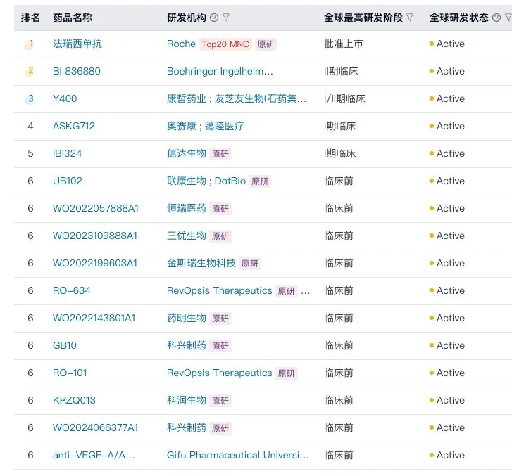 后续,只要国产Ang2/VEGF双抗在临床上持续交出有说服力的数据,就有望复制罗氏的打法,并在差异化上做出更多突破。同时,国产Ang2/VEGF双抗的临床前梯队也相当扎实,恒瑞、药明、科兴等7家企业正在积极推进管线研发。