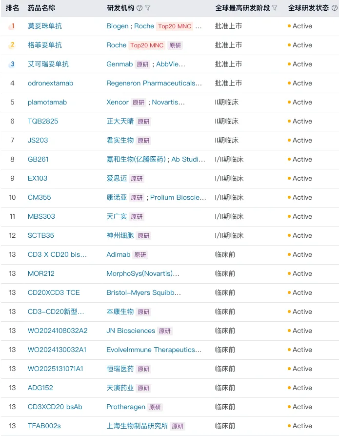 而CD3/CD20与CD3/CD19领域的国产TCE布局虽广,但已落地的BD交易仍相对有限,留有进一步突破的空间。CD20广泛表达于前B细胞至成熟B细胞阶段,既是经典抗肿瘤靶点,也是极具前景的新一代B细胞清除策略,特别是多发性硬化、系统性红斑狼疮、免疫性血小板减少症(ITP)等疾病中已有验证基础。目前该领域已有2笔国产双抗实现license-out,此外,正大天晴、爱思迈、天广实、神州细胞、君实等企业的同类产品处于临床推进阶段,整体阵容稳健。