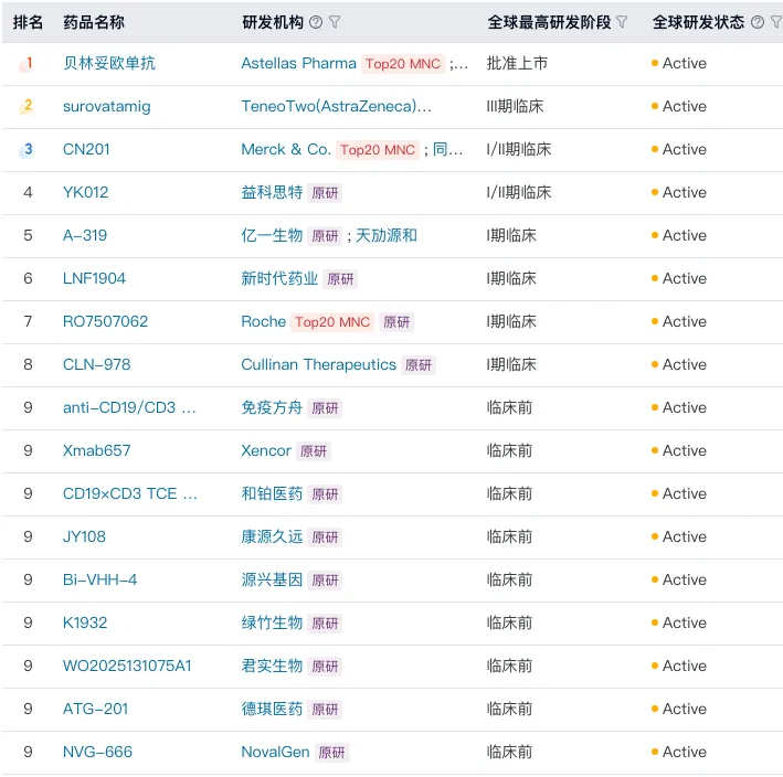 CD19从早期B细胞前体阶段开始表达,持续贯穿整个B细胞发育周期,仅在向浆细胞终末分化时消失,因此这种靶向疗法具备更强的B细胞耗竭能力。在国产CD3/CD19双抗阵营中,同润生物、益科斯特、亿一生物、新时代药业等项目已进入临床阶段,并已有1笔license-out交易落地。